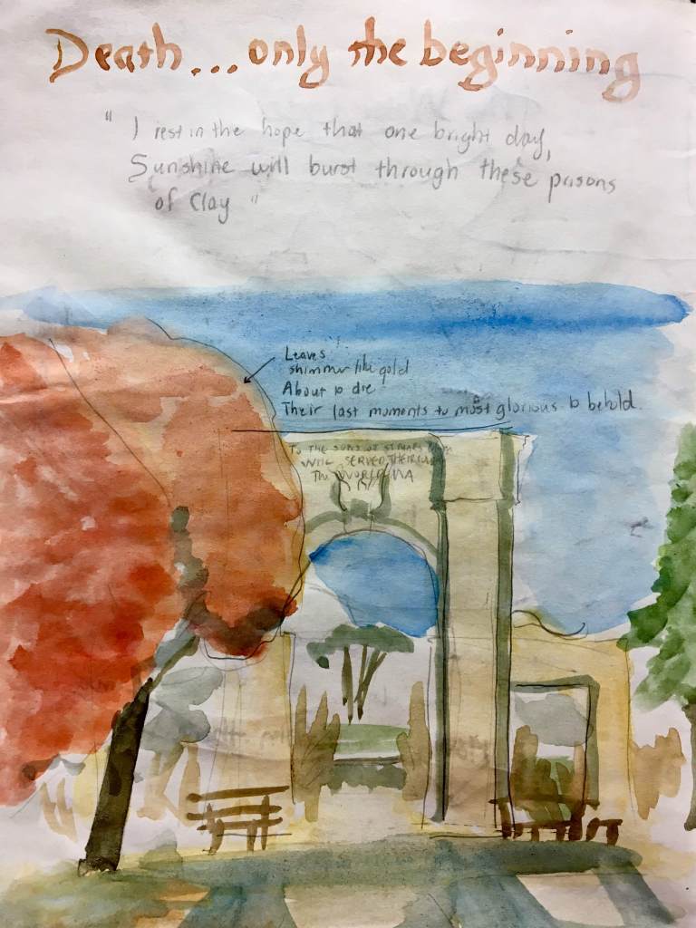 It’s not the most glamorous work, but 10-20min with pencil and watercolor captured the spirit of Autumn’s glory and the remembering of those who have come before us in St. Mary’s. This was done on an outing with my 5th grade students last year. We were sitting out in the sun, observing Autumn, and trying to see if we could draw any connections to the Catholic Liturgy of November 2, Autumn, and John Donne’s “Death be not proud.”