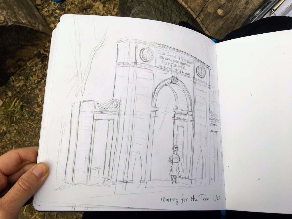 We had a historic steam engine pass through our town, right in front of our local WWI memorial, erected right where the students of the Jesuit school back in the ol’ days used to be picked up by the train. It was a long wait, so I kept my fidgety fingers busy and sketched the memorial arch (the second picture). Hopefully I’ll go back and paint it! I thought I’d include the third picture just for fun to show you the fruit of the waiting!