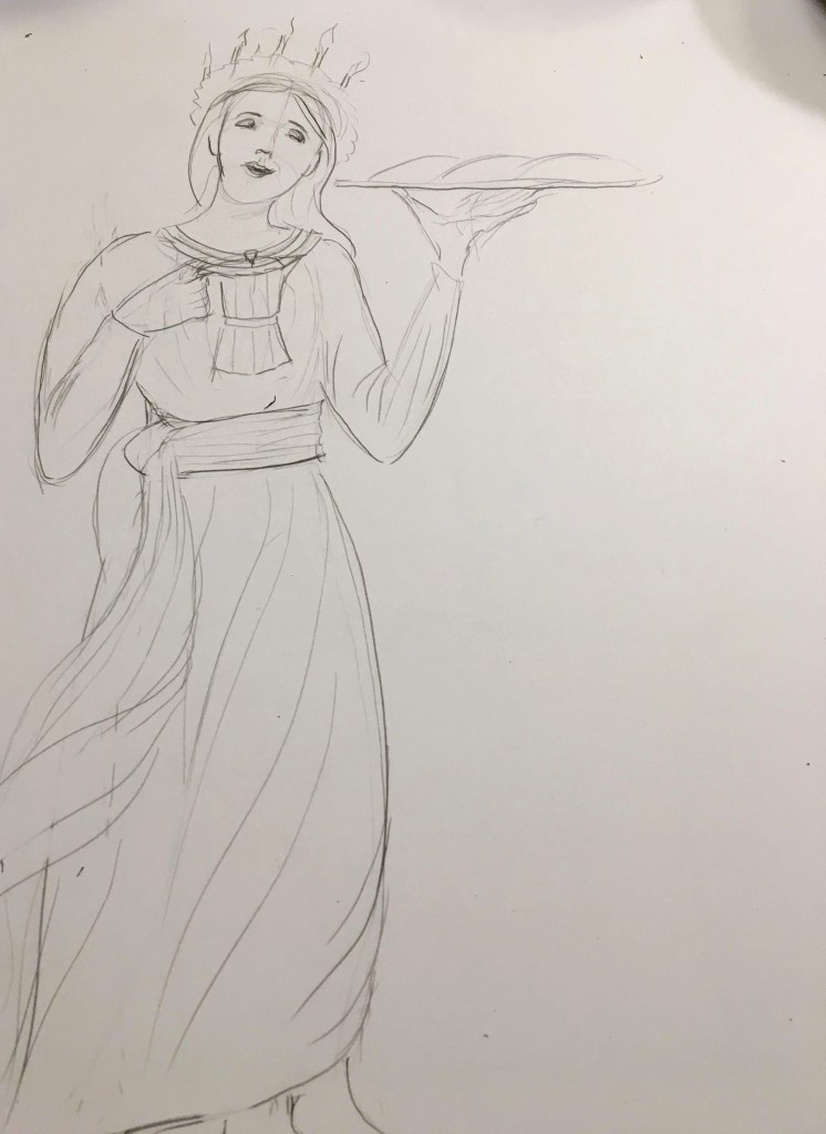 Finally, my mother and sister want to sell Sancta Lucia buns in honor of her feast day on December 13. We thought it’d be fun to have a nice label to go with the packaged goods, so this lovely lady was the fruit of several tries. We’ll see how she turns out!