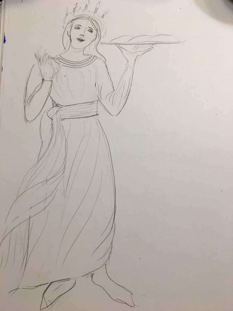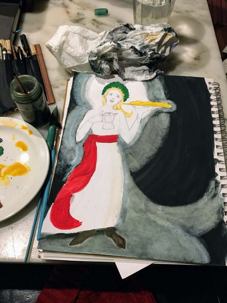 I worked on her a little each day, and finished her the other night. I love how she looks so bright and cheerful in the darkness and how the Bialetti, a stovetop espresso maker, came out. Her thumb is a little weird. I learned how I could have made the background more solid…because of that I kinda like parts of the drawing better than the painting.