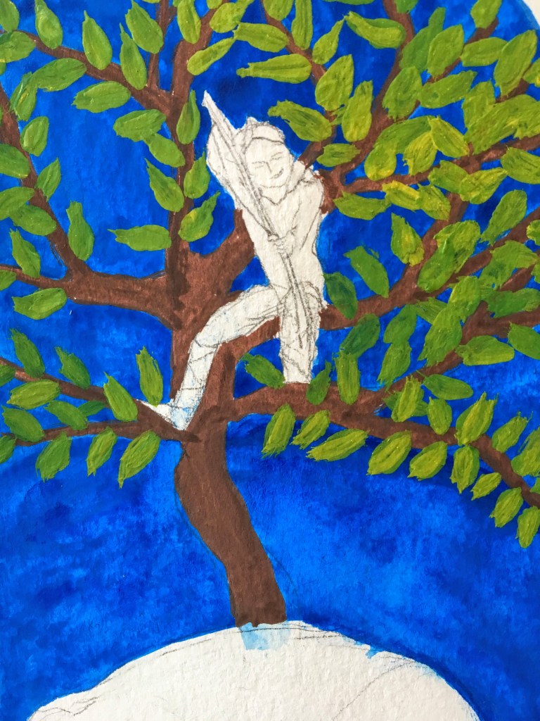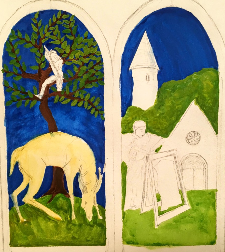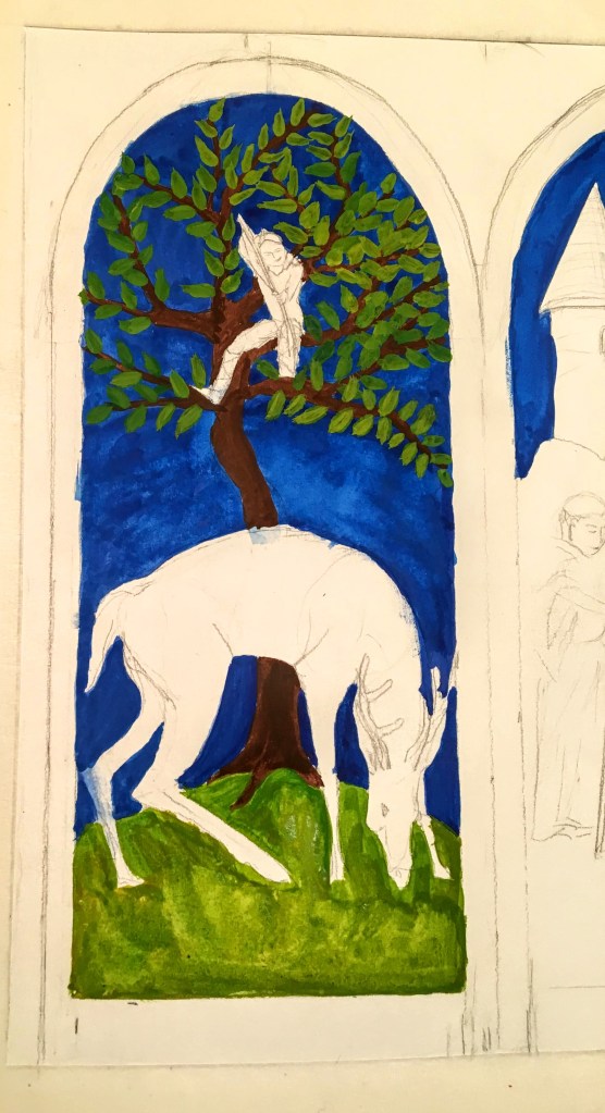 My favorite so far is the archer, and his leafy tree. So much better than the first one, Deo gratias. The deer needs a little help. And I am scared to do the monk and his illuminated letter. It’s like climbing a mountain and getting to the most treacherous part, right below the summit: you make, you got it, but if you make one wrong move…may your attempt rest in peace.