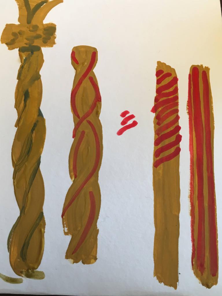 While working on the project that day, I was able to be grateful yet again for my travels -food for imagination – and for a good ol’ friend who showed me a twisting Byzantine pillar, inlaid with mosaics, in St. Clement’s Basilica in Rome. He unknowingly started me on a love of finely crafted, winding yet supporting, pillars of stone.