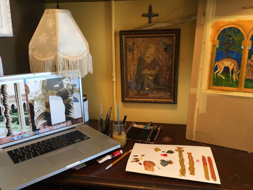 I got out my travel journal and photos of the cloister of St. John Lateran’s in Rome, and played around till I was confident that I could get the pillars I was thinking of.