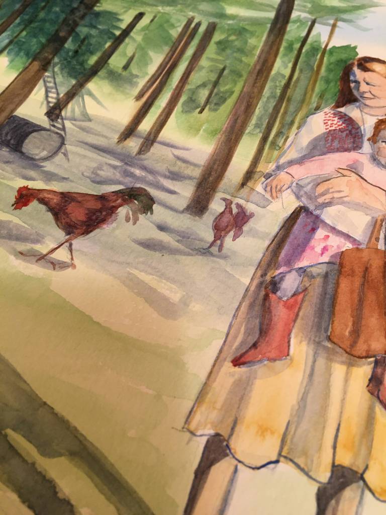 I think my favorite part is Mamma’s expression, the rooster, and the happy, plump, content ‘hanging’ of the baby (my Grandma) in Mamma’s arms.