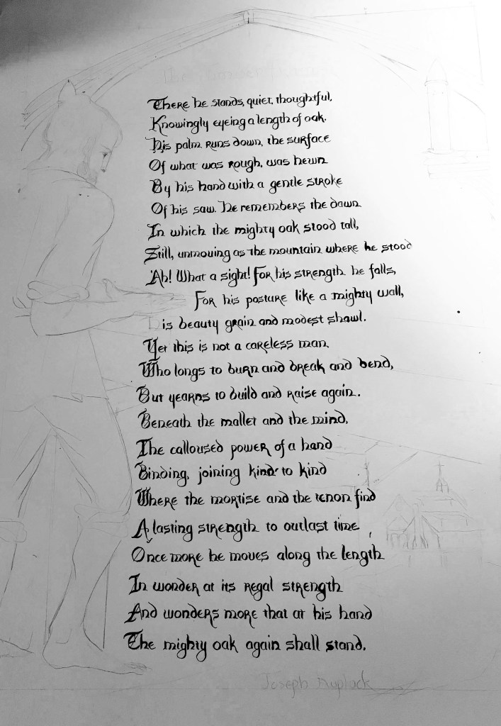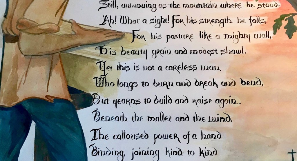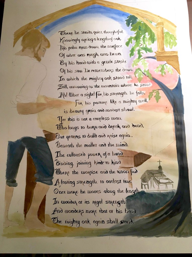 Last year was a year of wood. Our school principal was Fr. Wood; March was the month of St. Joseph, who earned his livelihood from wood, and in honor of that and in honor of our principal, many students gobbled up a song, “The Soldier and the Oak,” and finally a poem written by my colleague’s brother, who is a timber framer. Finally, a friend was getting married to a carpenter, and I had no clue what to make them for their wedding present. She didn’t like poetry very much, but loved calligraphy.