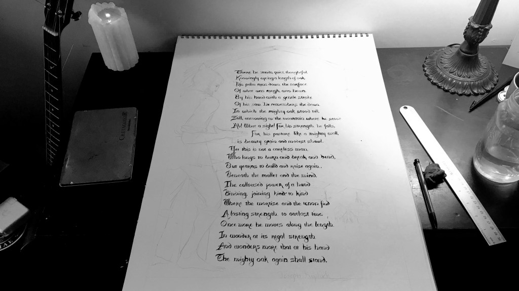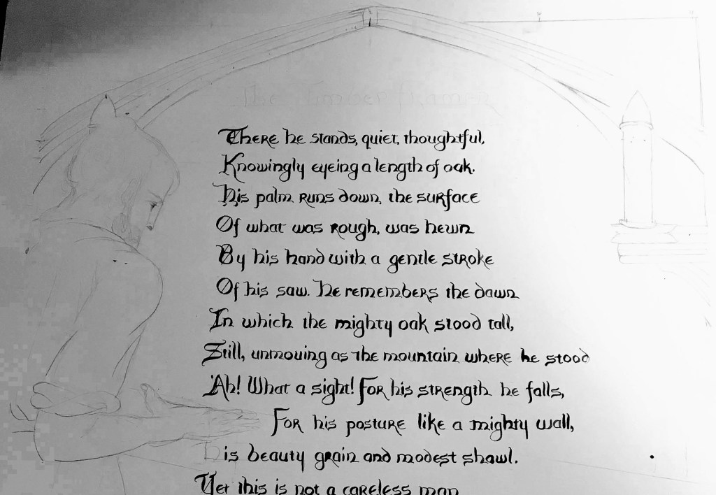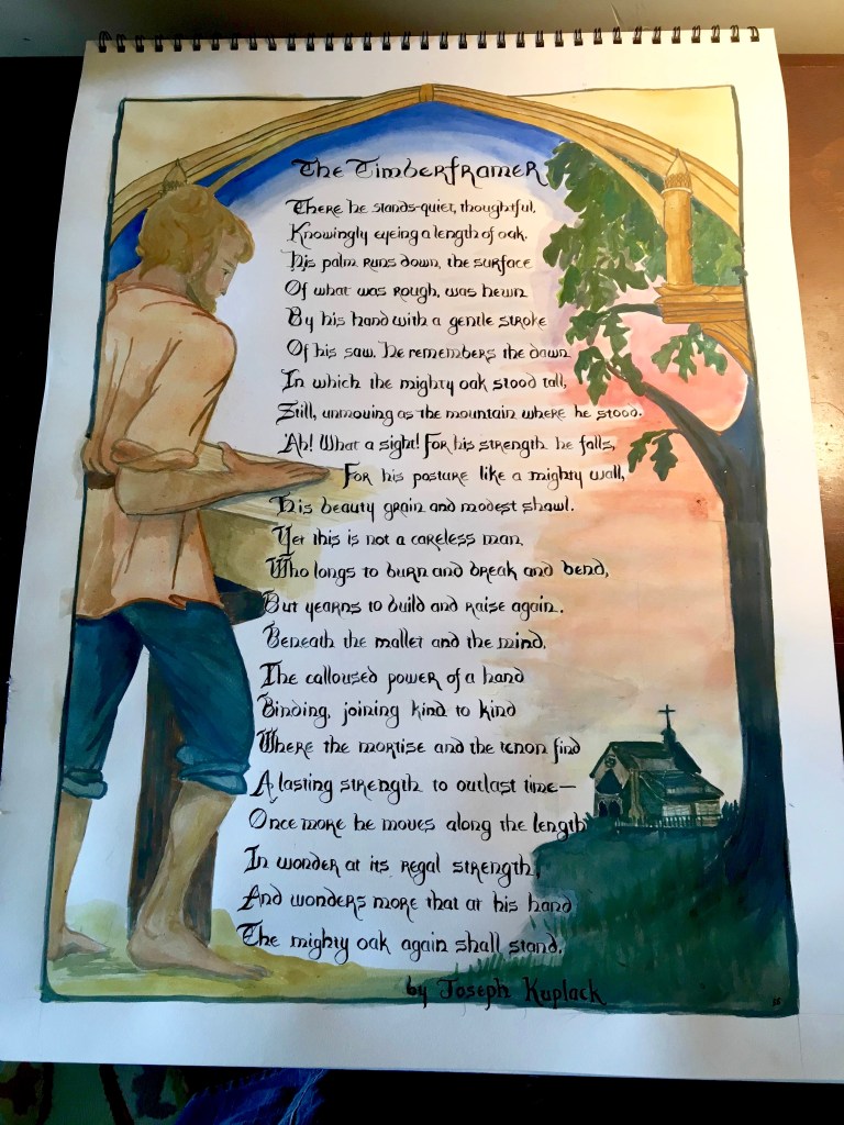 Then it dawned on me! Ahah! I could take poem, “The Timberframer,” and illuminate it! She would love the calligraphy, and he would love the fact that I thought about his talents.