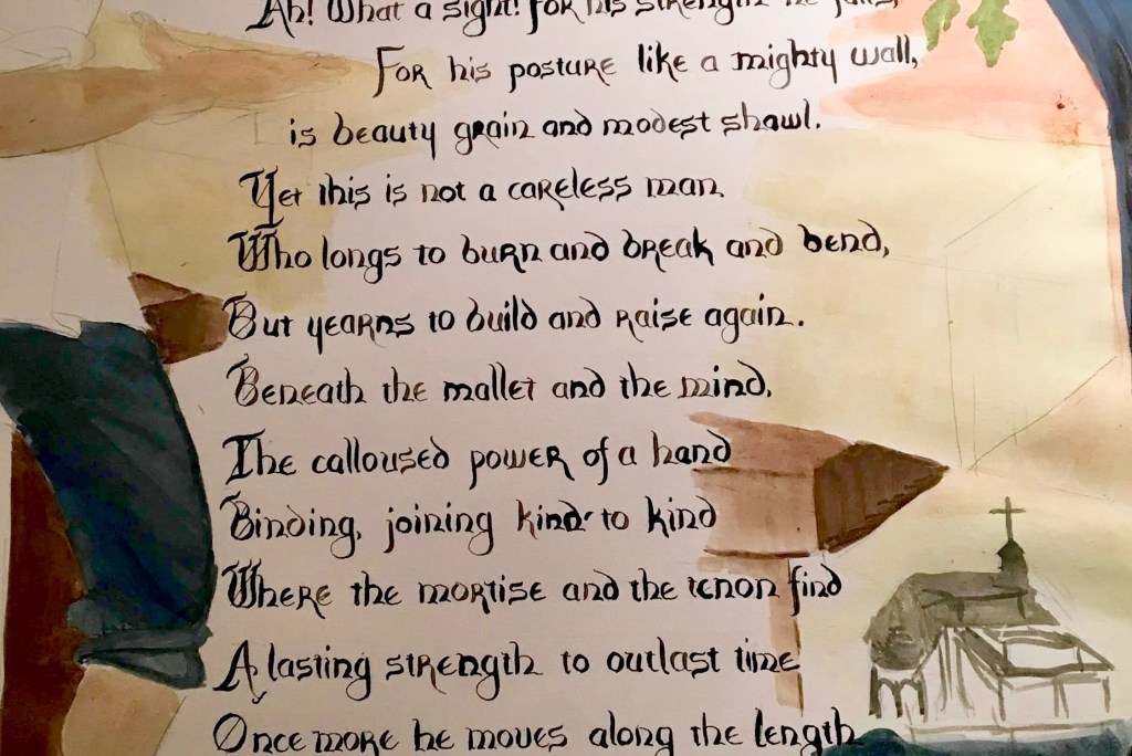 The wonderful piece, while it reflects on the noble work of the timber framer- truly an artisan trade- there is a parallel within the poem, likening the tradesman to Christ, “Who longed to burn, and break and bend, But yearns to build and raise again,” the temples of our hearts.