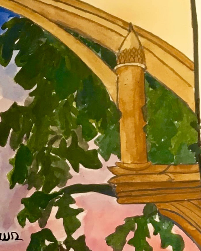 Behind the Gothic-inspired arch, one can recognize the leaves of the burr oak -a large and beautiful mushroom-shaped tree. One of them dominates a corner of our quad on our campus.