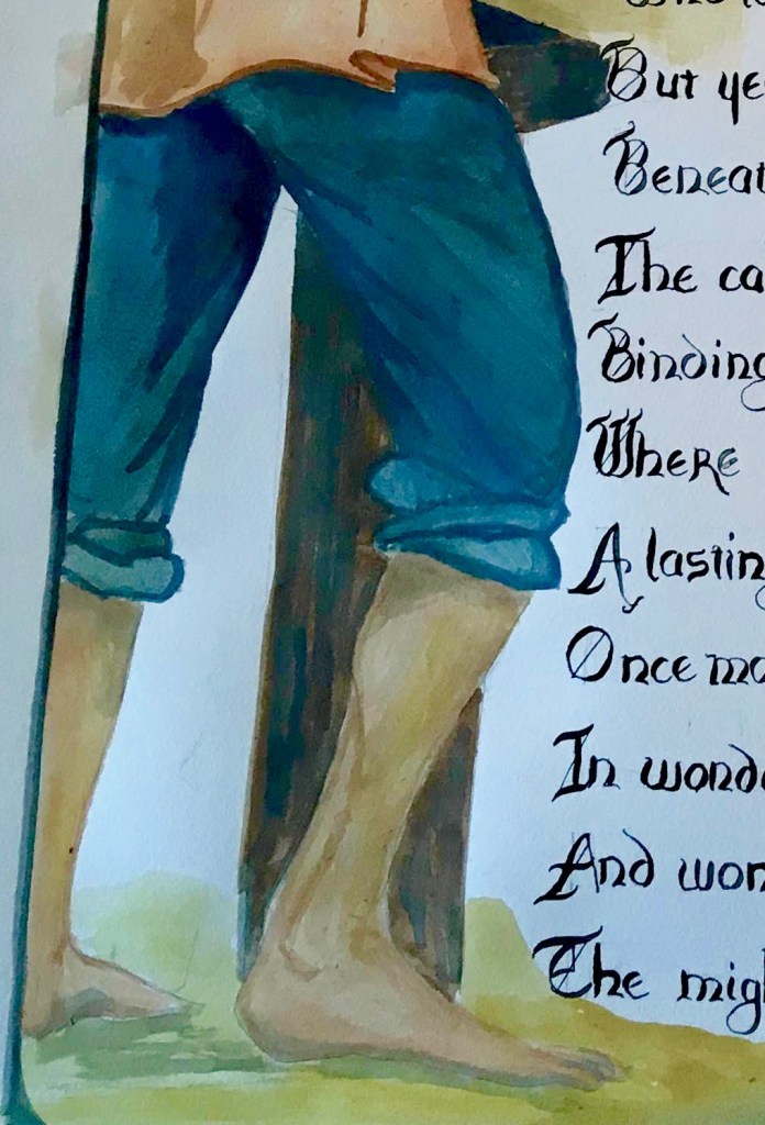 I loved too how the tunic falling on the pants and the pant legs and the feet turned out. He probably in real life would have had protective boots one, but it seemed like a nice nods towards the poet and his family’s personal style.