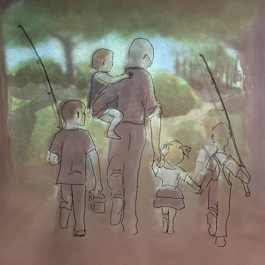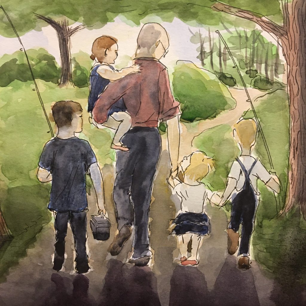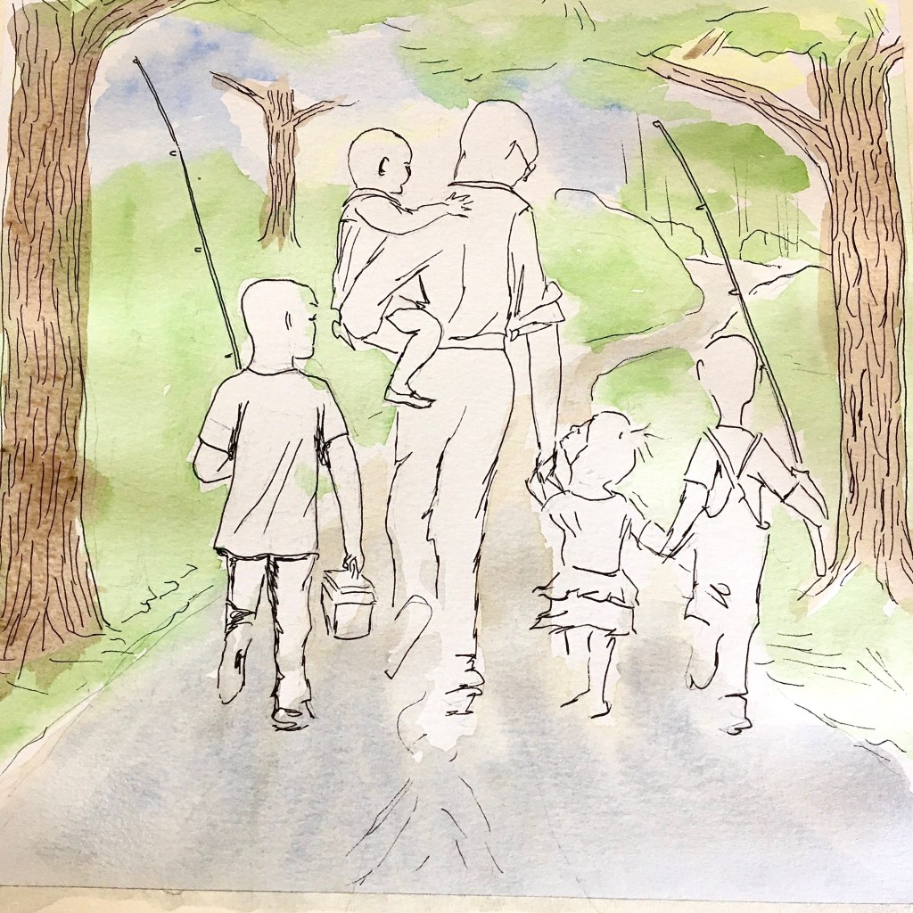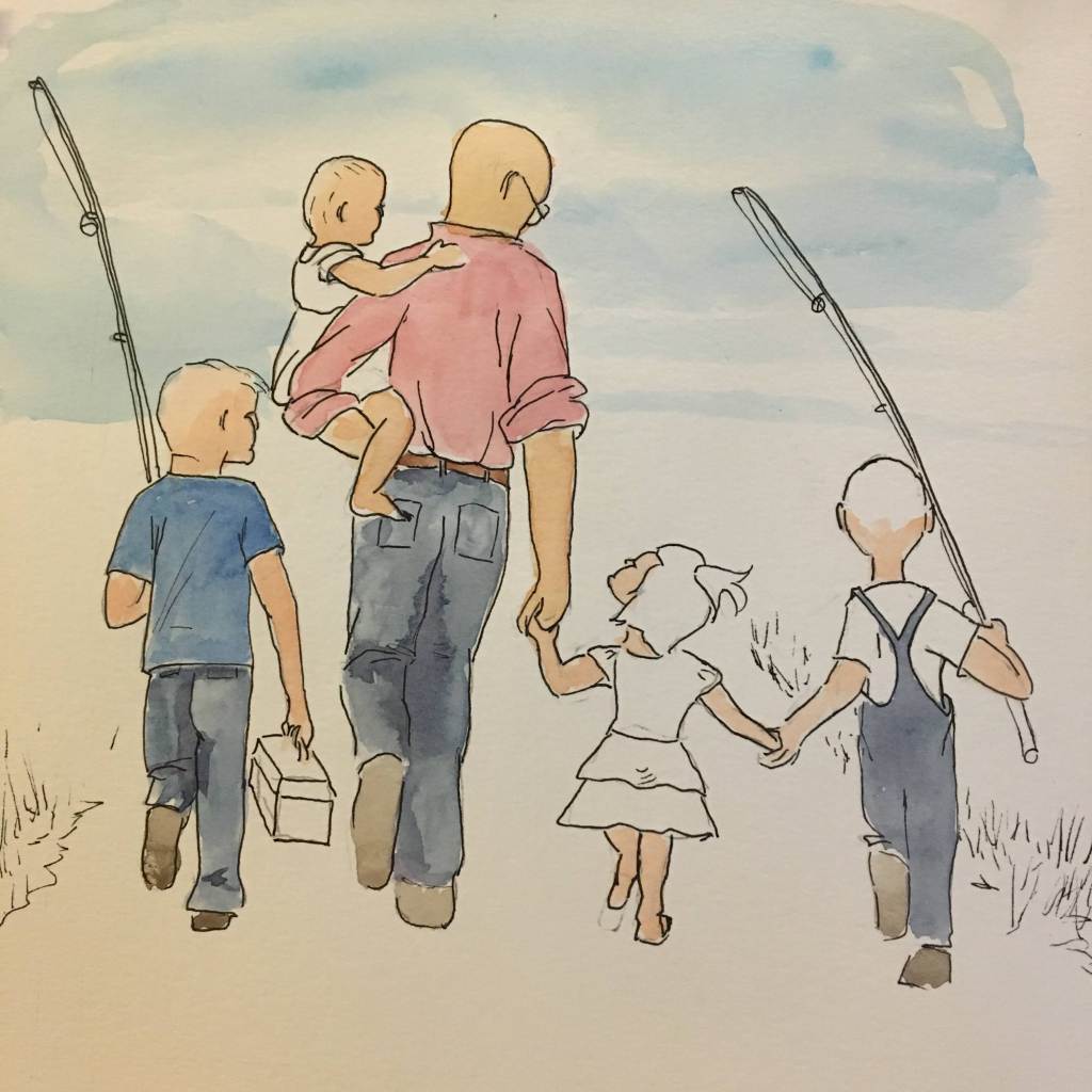 The mom was doing dishes one day and looked out the window to see her husband walking down the road with one girl in his arms, and holding the other girls (my friend) flanked by their two brothers with fishing rods.