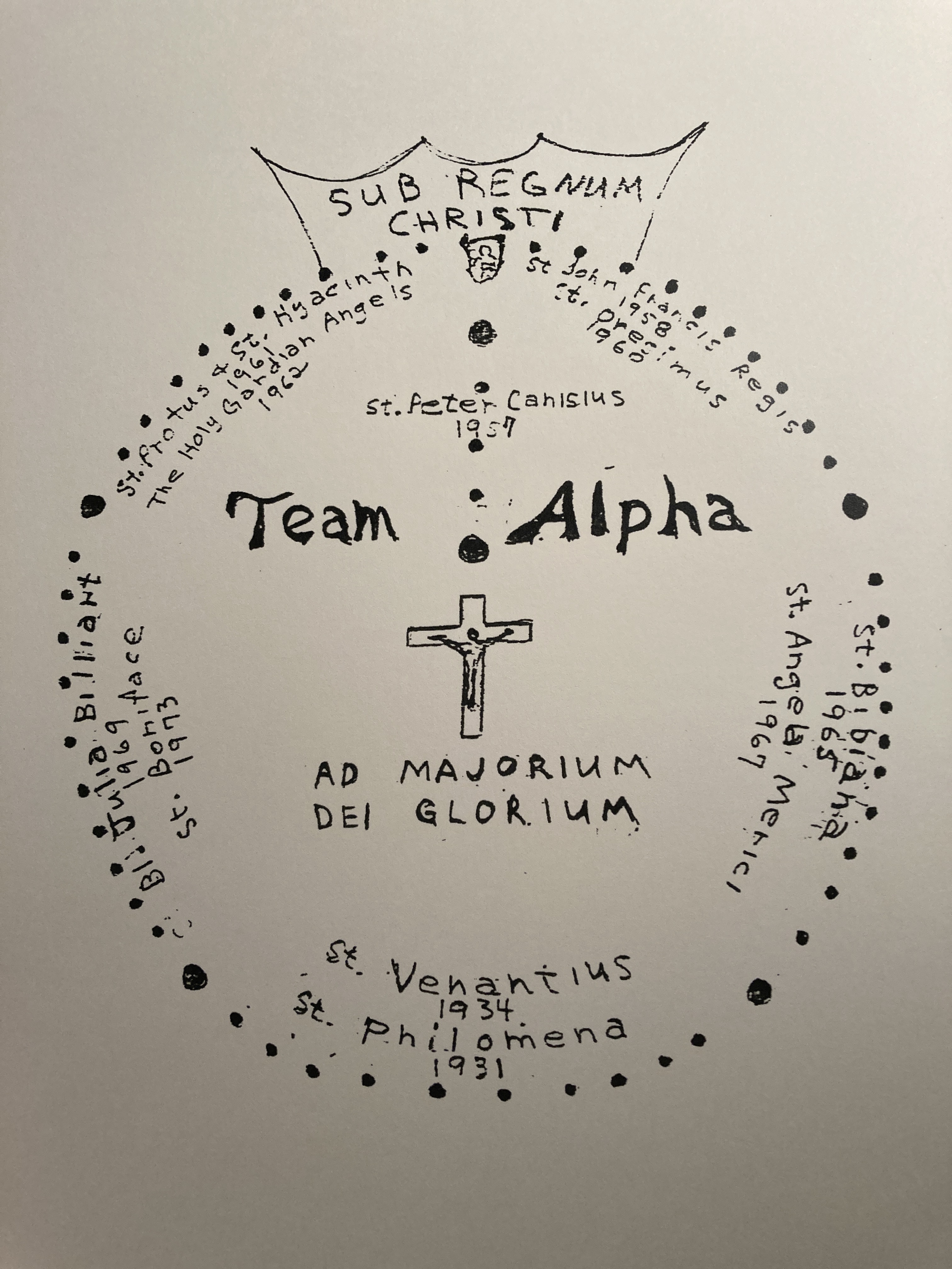 Years ago, and not too egotistically, Grandad began to refer to his family as Team Alpha. He drew a symbol of his desire for his marriage and family to be united under Christ the King, through the Our Lady, with her Rosary.