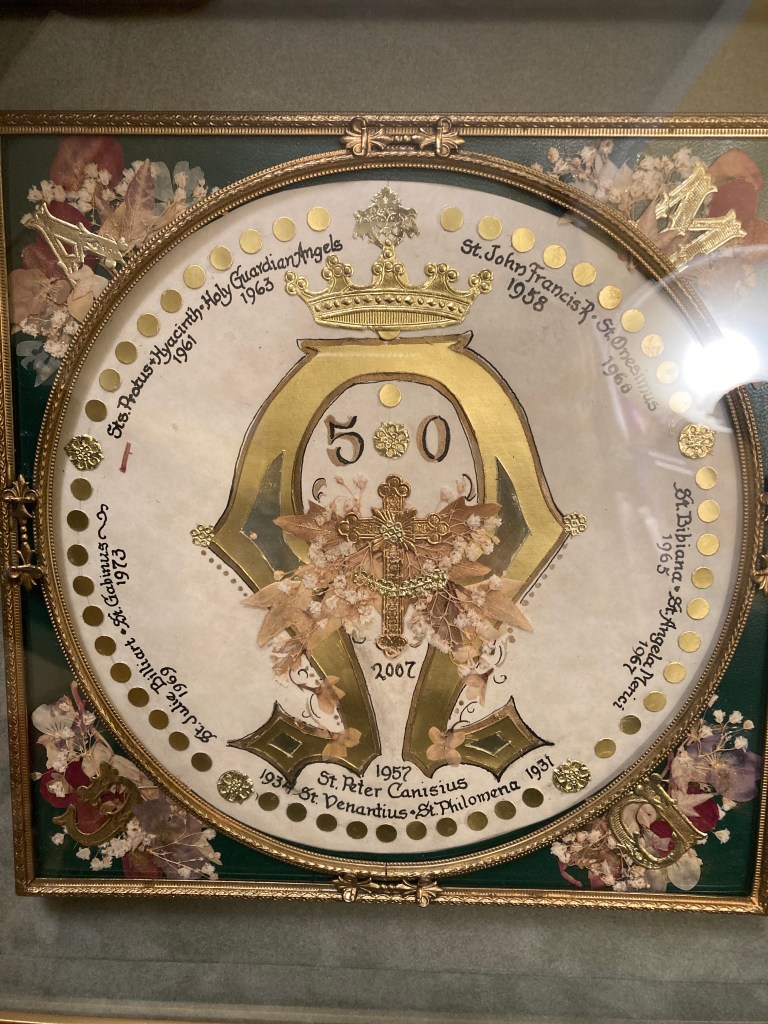 As you can see in the photo of his drawing, Grandad was pretty thoughtful about the whole design. He included the birthdates with the patron of the birthday of both him and Grandma, as well as all eight children. Their wedding day stems from the cross.