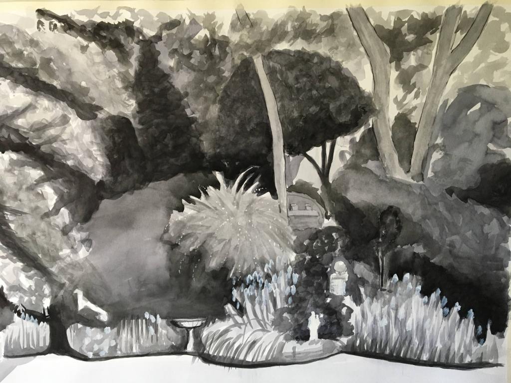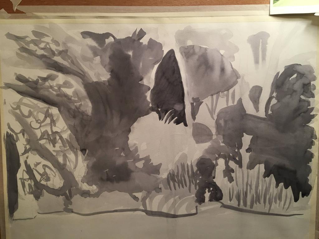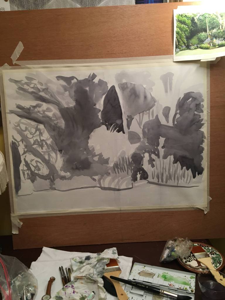 In the preliminary stage, there was a lot of visiting the scene, talking to the family, taking close up pictures, sketching in various ways, and trying out different ways of approaching painting.