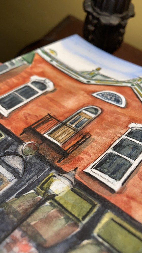 Those apartments , the one you can see above with the bay window, was the first home of one young family. When they saw my travel journal sketch of the store, they asked me to do a small commission on their first home.