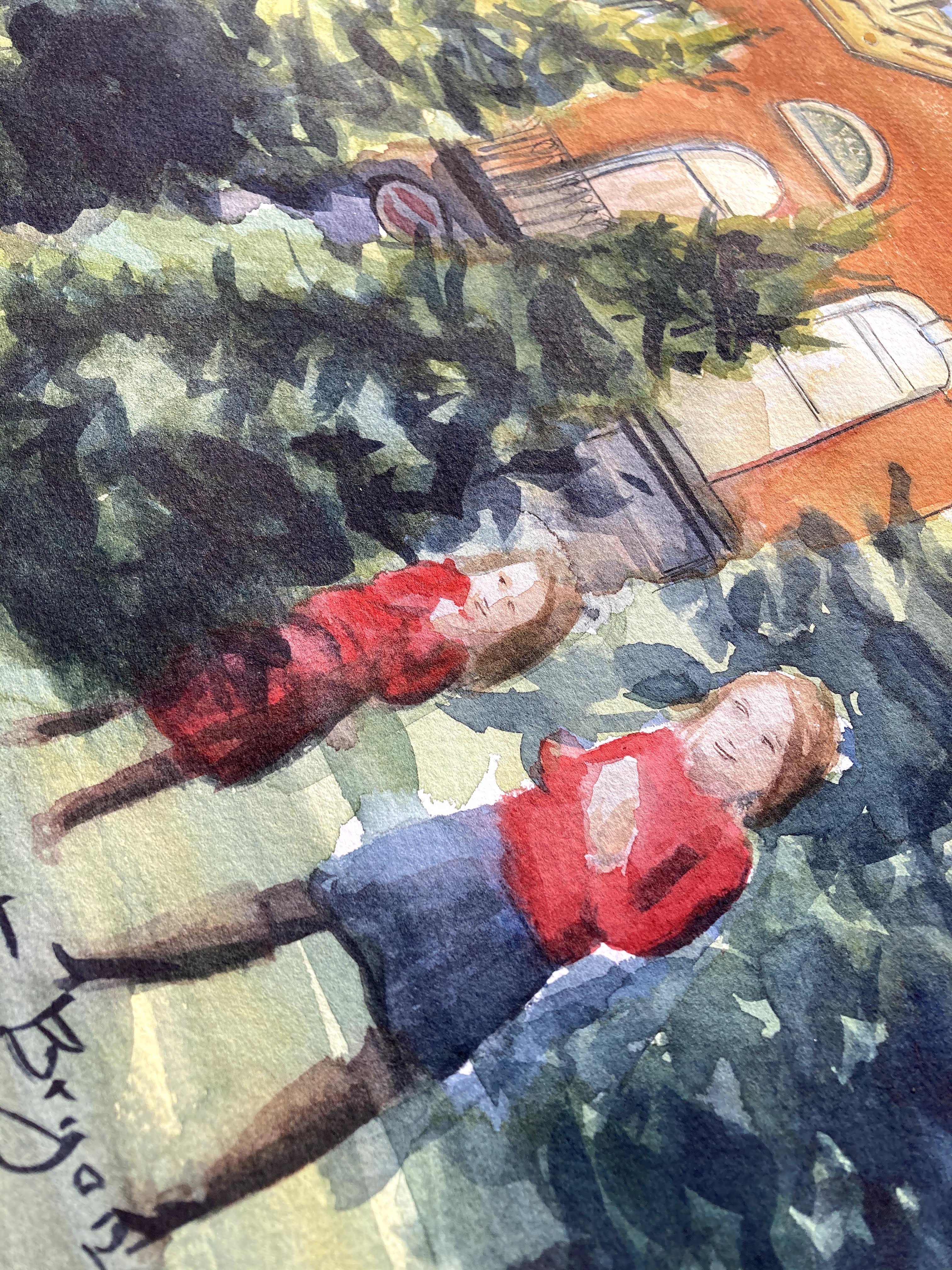 So I decided to go down there one day as a break between my grading and capture the scene. It was the perfect golden hour. I bit off more I could chew in the size of my painting – 12×20,” but named to capture the scene pretty well for the first time round, and managed to work in some people that happened to walk down there (my brother and sisters).