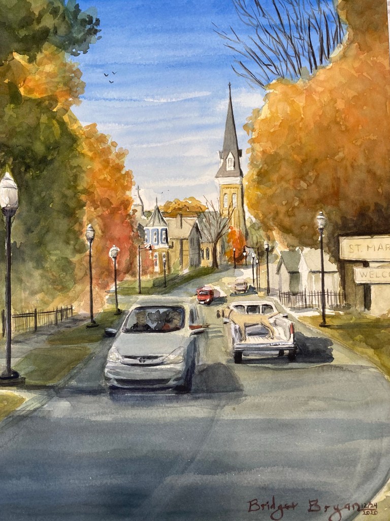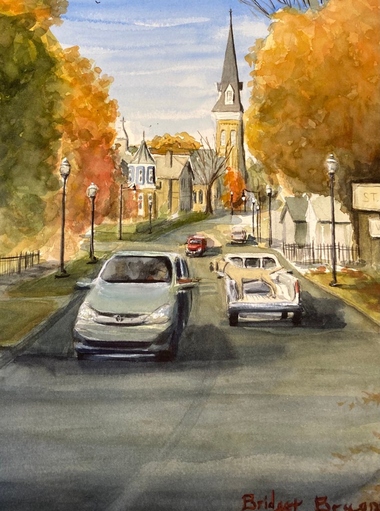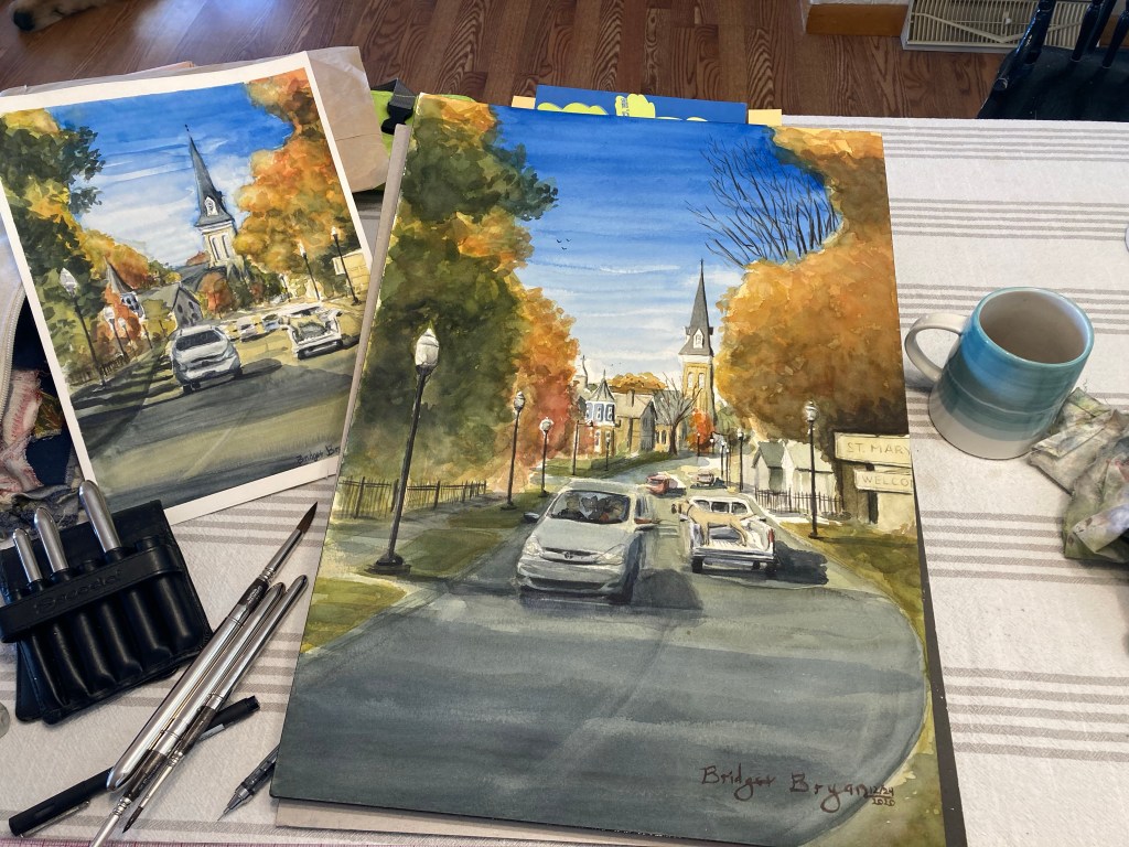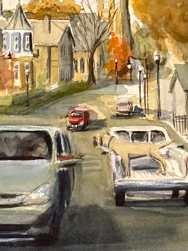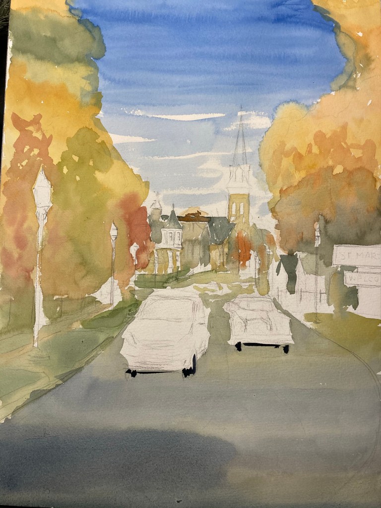 My mom had said that in all my paintings of around the town I ought to include something familiar to us or to locals. You know, “I spy” sort of details. Kind of like inside jokes for us locals.