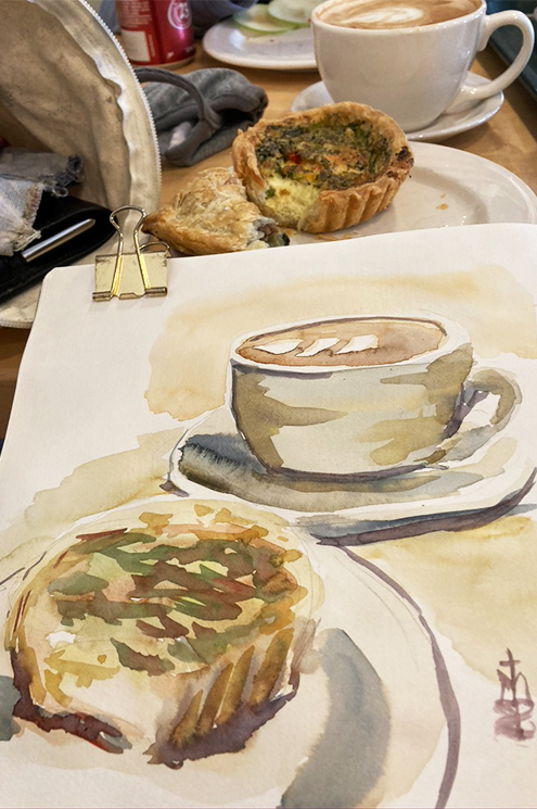 The breve cappuccino was so beautiful and the little quiche so pleasing that I thought I’d immortalize it on paper.