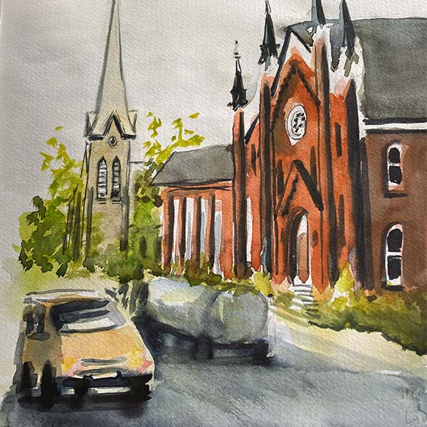 My mouth was drooling (figuratively) when I saw the architecture lining the street. I have a weakness for churches too. “Draw it.” the good voices whispered repeatedly.
