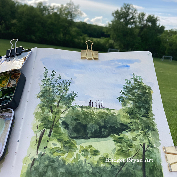 I did…brought a picnic, and plopped myself on a blanket (to protect myself from our local cross of chiggers), and listening to a podcast and the birds, and sipping some iced tea, I laid out my supplies, clipped my book, and started to paint. This was in-between taking tasty bites of warm rotisserie chicken wrapped in homemade pita and dipped in a feta and basalmic sauce made by a dear roommate.