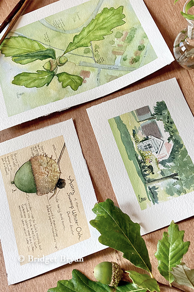 Looking at this last photo, I felt that my work is reflects my blend of interests: nature study (the acorn), love of maps (the large vertical has a background map of where I was when I was painting these scenes), and just appreciating the local beauty around me (the garden scene).