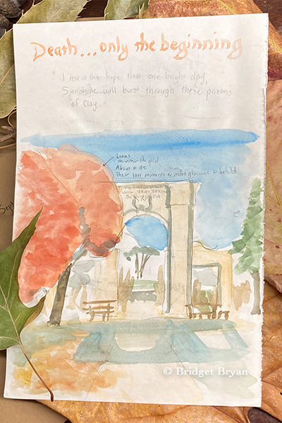 It captures the bright maple leaves, brightest in their dying moments. In the background is The WWI Memorial Arch which honor the fallen bright lights of the self-sacrificing heroes of WWI from St. Mary’s College. The text links the visible (the leaves) and invisible layers (the fallen heroes) to the reality held up in the Liturgical year at this time: death is part of life, and it is only the beginning. The final life, the everlasting life begins with death, just as a new season begins with the falling leaves and a still, cold winter.