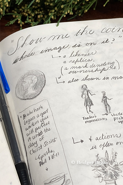 My head THINKS in both IMAGE and WORD, and after realizing the Christ is the Word made Flesh, perfect image of Our Father, and that we are meant to be images of God too, it felt appropriate to discreetly capture the thoughts of the Sunday liturgy and sermon in a quickly little entry in my pocket notebook.