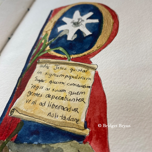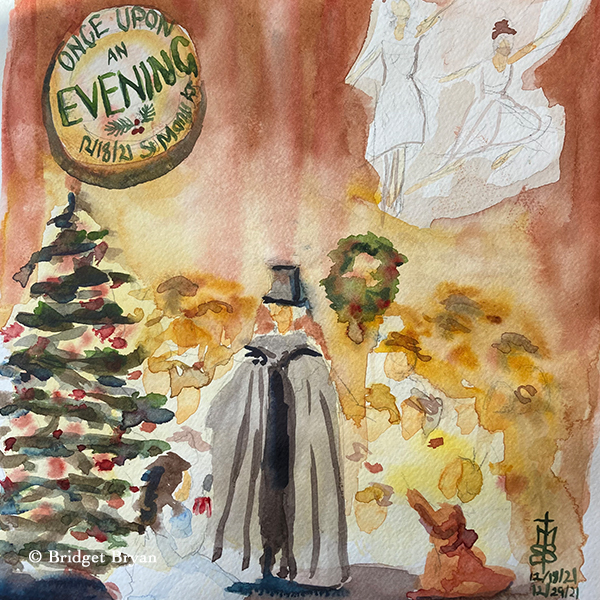 In this post I’ll share the things I worked on while I was sick: A little story that came to me while I was sick; touching up a scene I captured at our local Nutcracker performance, finishing some little treasures I found on my daily walks, and finally, getting down on paper some sketches of the O Antiphons. The photos of the work will be interspersed throughout the story, and will include little captions about the photos.