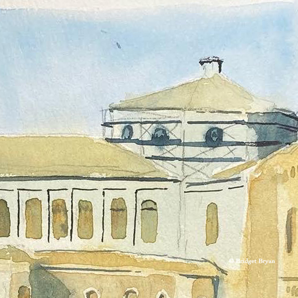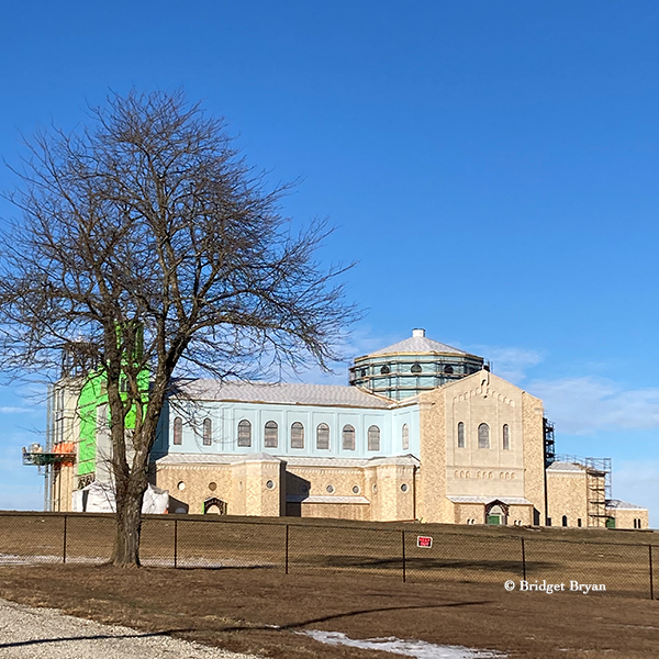 The bell towers are being clothed, steadily but surely. All the different garments: the outrageous green waterproofing paper and insulataion (I think that’s what it is!), grey mortar cement, and the variated brick with the ornamental stonework. Already the bells wait, ready for shipping in France. The bells are the giant earrings of the Church: “She shall make music wherever she goes.(Mother Goose)