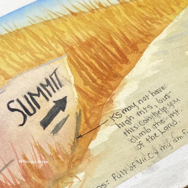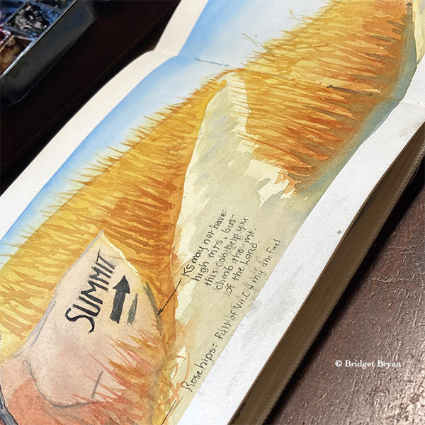 All along the gravel paths I discovered shells as I walked and sipped my coffee. It wasn’t until I sat down with my sketchbook to sketch the “Summit” rock that it dawned on me! How cool! They were mussel shells, and even found a fossil of an ancient type of shell!
