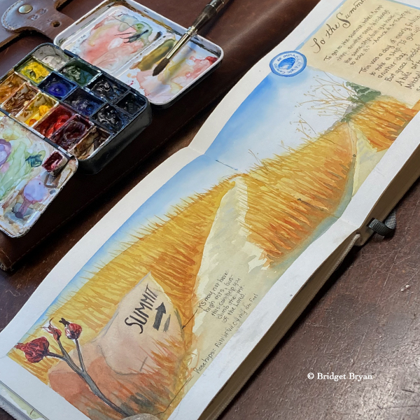 These pictures were completed in little steps, just like a real travel journal. I sketch them on scene, and when possible, paint them there too. I always learn a lot painting-wise after each spread. This time, the lesson learned was to do my lettering in ink BEFORE I paint!