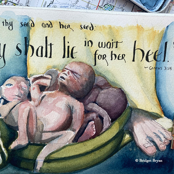 He’s throwing the historic apple core at a certain slithering serpent, which is conveniently disappearing through the map of time and history [see below], leaving Adam and Eve to experience the grief and anger created by their choices.